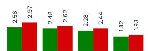FIGURA 3. Edad promedio para cada posición. En verde, promedio en el equipo. En rojo, promedio de los jugadores en campo (excluye los suplentes).