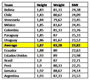 The average weight was 1.78 kg above the average weight recorded for the 2014 World Cup (81.5), and the BMI (23.82) somewhat higher than that of the World Cup (23.13). The average of the body mass index of the goalkeepers of the countries below the average height (all Latin American), is slightly higher than that of the countries above the average (United States and Jamaica, among others), being 24.14 for the lowest and 23.95 for the tallest.